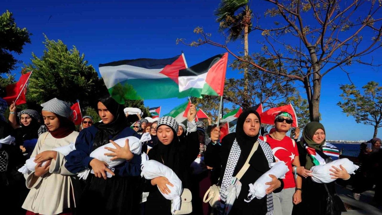 Antalya Kudüs Platformu’nun çağrısı ile Gazze’de yaşanan katliama dikkat çekmek amacıyla yürüyüş düzenlendi. Ellerinde Türkiye ve Filistin bayrakları bulunan binlerce kişi, Konyaaltı Olbia meydanında toplandı. Yürüyüşe karadan motosiklet gruplarının yanı sıra denizden de tekneler eşlik etti. Ellerinde Gazze’de hayatını kaybeden bebek ve çocukları temsil eden kefene sarılmış bebek figürleri bulunan grup üyeleri, ‘Antalya’dan Gazze’ye direnişe bin selam’ ve ‘Çocuklar ölürken sessiz kalınmaz’ sloganları attı. Konyaaltı Kent Meydanı’na kadar olan yaklaşık 2 kilometrelik yürüyüşe katılanlara çevredeki vatandaşlar da destek verdi.