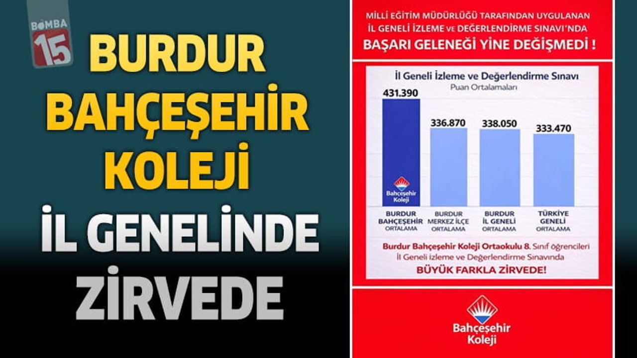 Burdur İl Milli Eğitim Müdürlüğü tarafından gerçekleştirilen İl Geneli İzleme ve Değerlendirme Sınavı sonuçları açıklandı. Açıklanan sonuçlara göre Burdur Bahçeşehir Koleji Ortaokulu 8. sınıf öğrencileri, elde ettikleri 431.390 puan ortalamasıyla Burdur Merkez İlçe, Burdur İl Geneli ve Türkiye ortalamalarının üzerine çıkarak önemli bir başarıya imza attı.