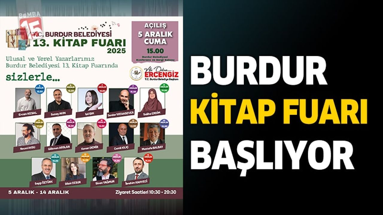 Burdur Belediyesi tarafından düzenlenen 13. Kitap Fuarı 5 Aralık’ta Burdur Belediyesi Konferans ve Sergi Salonunda açılıyor. Kitap fuarıyla ilgili açıklama yapan Burdur Belediye Başkanı Ali Orkun Ercengiz, Bu yıl 13’üncüsünü gerçekleştireceğimiz Kitap Fuarımızda, geçmiş yıllarda olduğu gibi gençlerimizi, çocuklarımızı ve kitap dostu tüm vatandaşlarımızı edebiyatın büyülü dünyasıyla buluşturacağız. Büyük bir ilgi ve coşkuya sahne olacağına inandığımız fuarımıza tüm hemşerilerimizi; kitaplarla, yazarlarımızla ve kültürle dolu bu özel buluşmaya davet ediyorum.” dedi.
