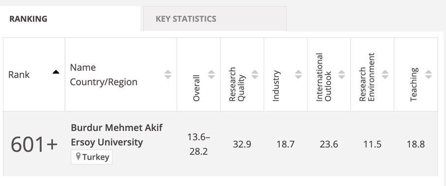 Burdur Mehmet Akif Ersoy Üniversitesi (MAKÜ), Times Higher Education (THE) tarafından yayınlanan 2025 Asya Üniversiteleri Sıralamasında önemli bir başarıya imza atarak Asya’nın en iyi üniversiteleri arasında yer aldı. Dünyanın önde gelen yükseköğretim derecelendirme kuruluşlarından biri olan THE tarafından yapılan değerlendirmede, MAKÜ Asya genel sıralamasında 601+ bandında konumlandı.