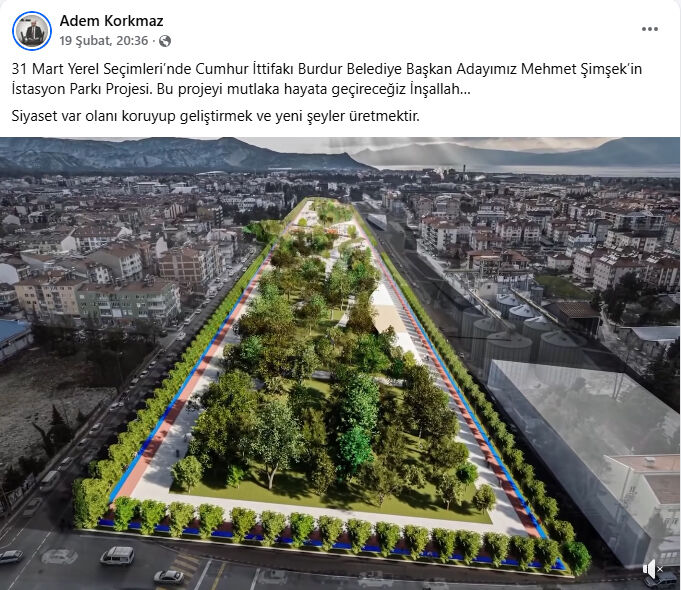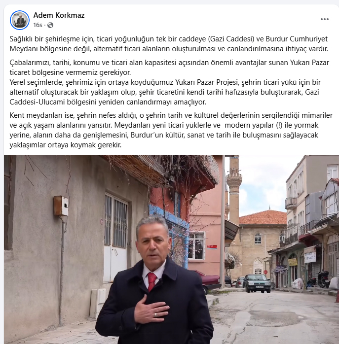 Bu açıklamadan birkaç saat sonra AK Parti Burdur Milletvekili Adem Korkmaz’dan gelen paylaşım dikkat çekti. Korkmaz, yerel seçimlerde belediye başkan adayı olan Mehmet Şimşek’in vaatleri arasında bulunan Yukarı Pazar Yeri dönüşüm projesini gündeme taşıdı.