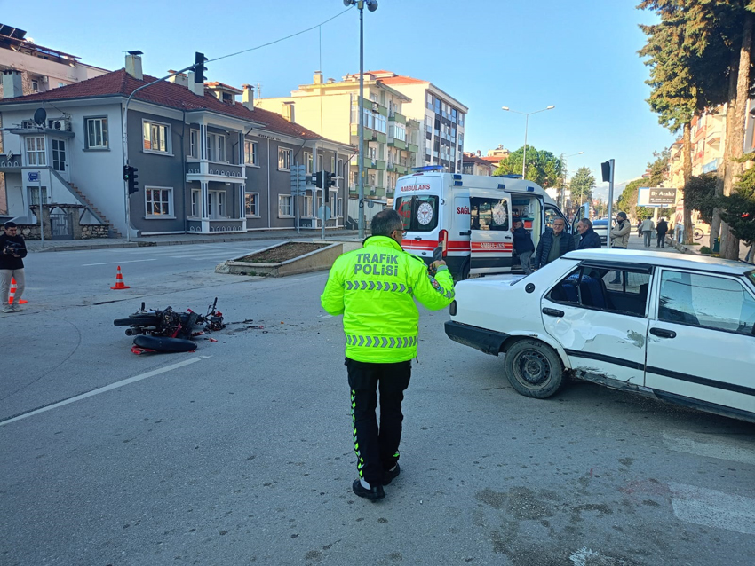 Burdur’un Bucak ilçesi Süleyman Demirel Bulvarı üzerinde, eski Hükümet Binası önünde motosiklet ile Tofaş marka otomobil çarpıştı.