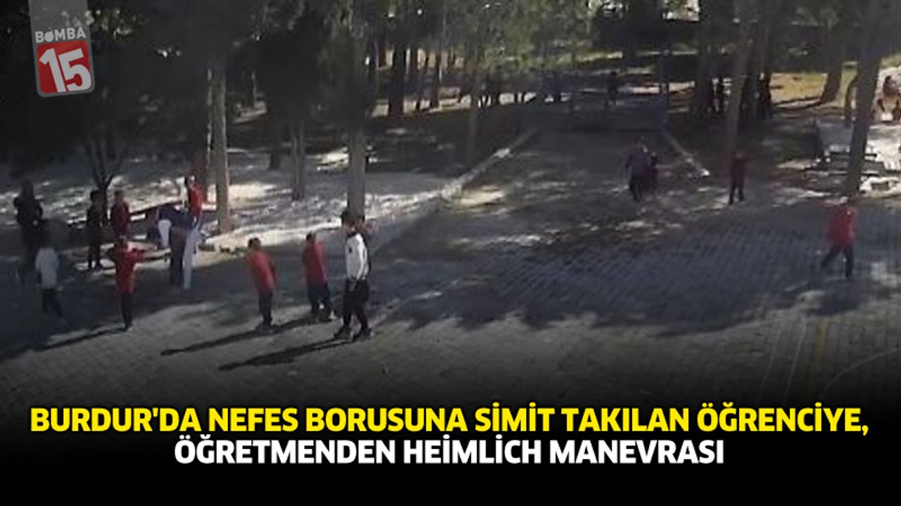 Burdur'da okulda nefes borusuna simit dilimi takılan öğrenciyi, öğretmenin Heimlich manevrası kurtardı. Olay anı ise okulun güvenlik kamerasına yansıdı.
