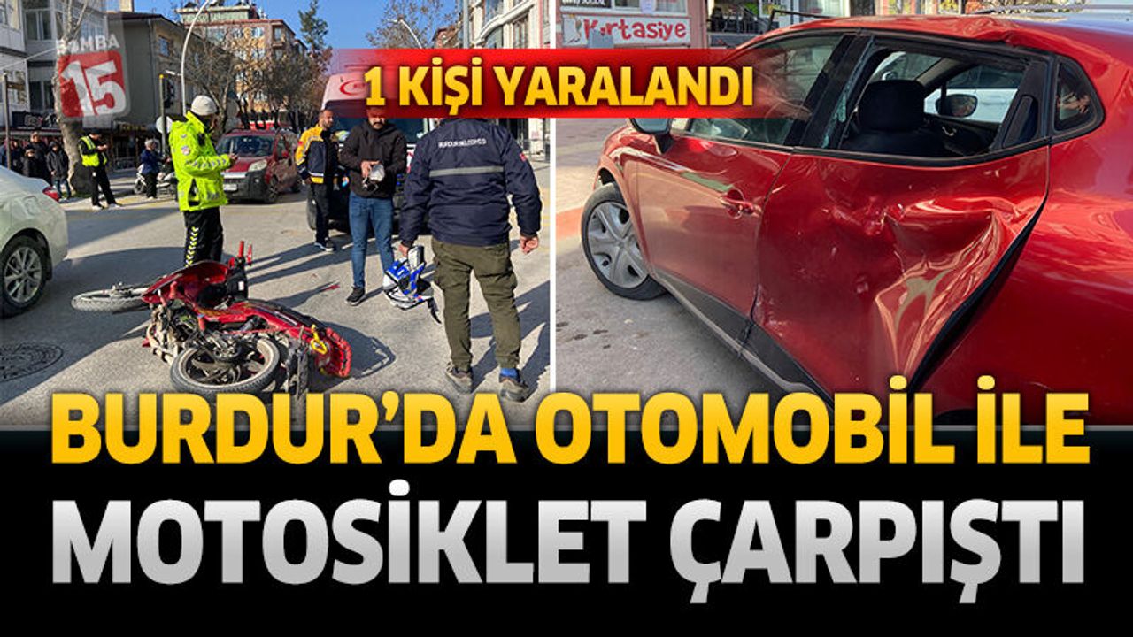 Burdur Atatürk Caddesi ile Şehit Özpolat Caddesi kavşağında sabah saat 09.30 sıralarında trafik kazası meydana geldi. Edinilen bilgilere göre Atatürk Caddesi üzerinde seyir halinde olan 15 AEL 684 plakalı motosiklet, Şehit Özpolat Caddesi’nden çıkan 34 RG 5440 plakalı otomobil ile çarpıştı.