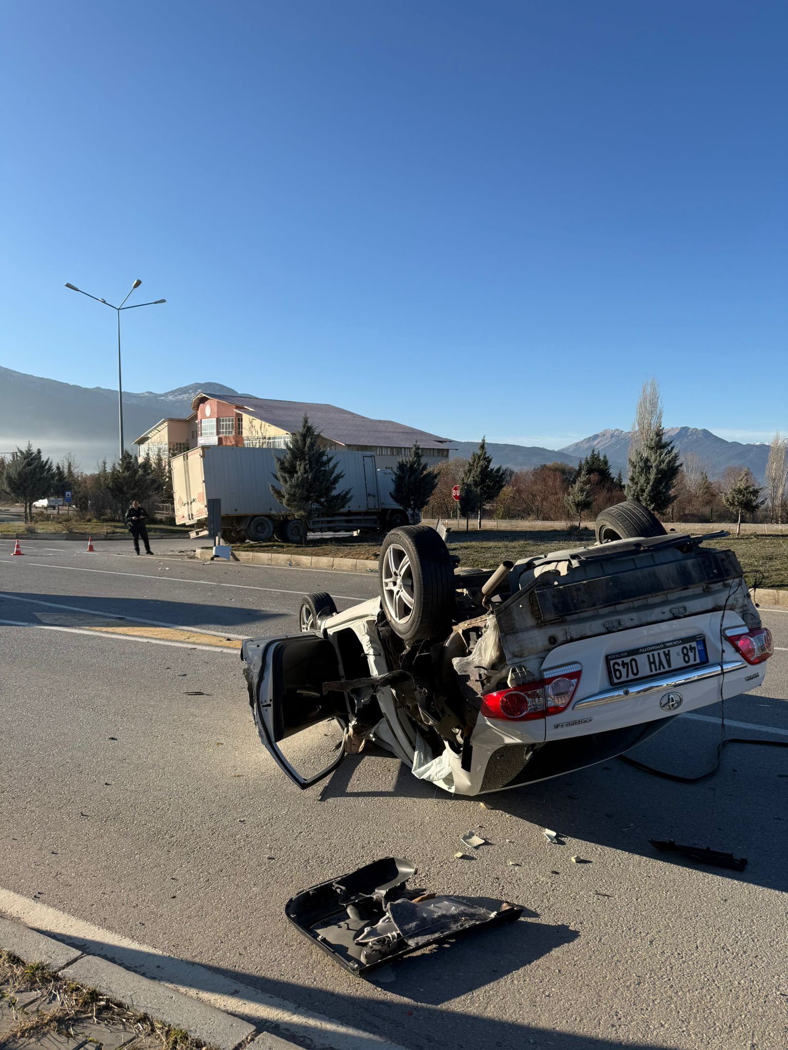 Edinilen bilgilere göre, 32 ABA 083 plakalı kamyon ile 48 AYH 049 plakalı otomobil kavşakta çarpıştı. Çarpmanın etkisiyle otomobil takla atarak durabilirken, kamyon orta refüje çıktı.