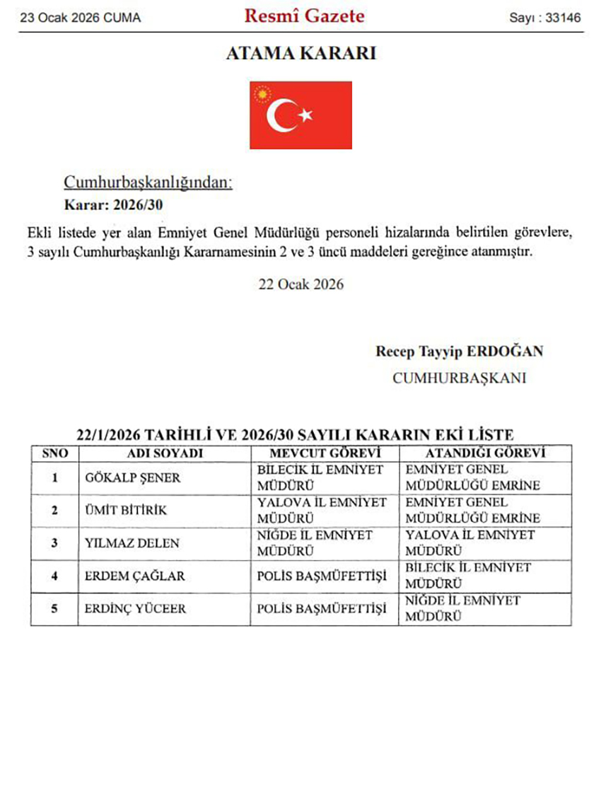Cumhurbaşkanlığı tarafından yapılan atama kararları, 23 Ocak 2026 tarihli Resmi Gazete’de yayımlandı. 2026/30 sayılı karar kapsamında Emniyet Genel Müdürlüğü bünyesinde bazı il emniyet müdürlüklerinde görev değişiklikleri gerçekleştirildi.