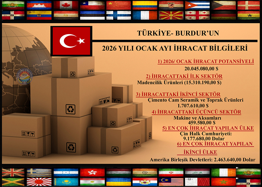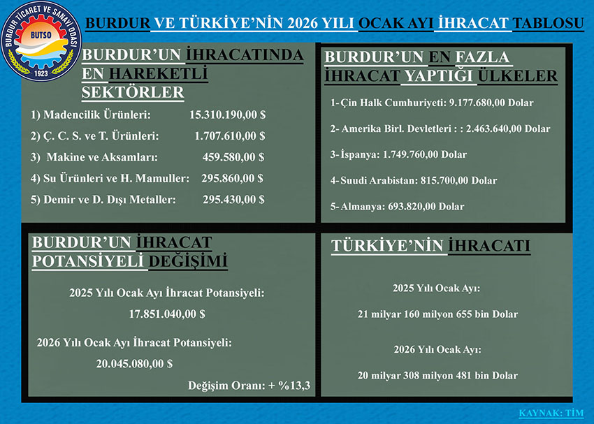 Burdur’un 2026 yılı ocak ayı ihracatı, geçen yılın aynı ayına göre yüzde 12,3 artış göstererek 20 milyon 45 bin 80 dolar oldu. Burdur Ticaret ve Sanayi Odası (BUTSO) Yönetim Kurulu Başkanı Yusuf Keyik, ihracat rakamlarındaki artışın il ekonomisi adına önemli bir gösterge olduğunu belirtti.