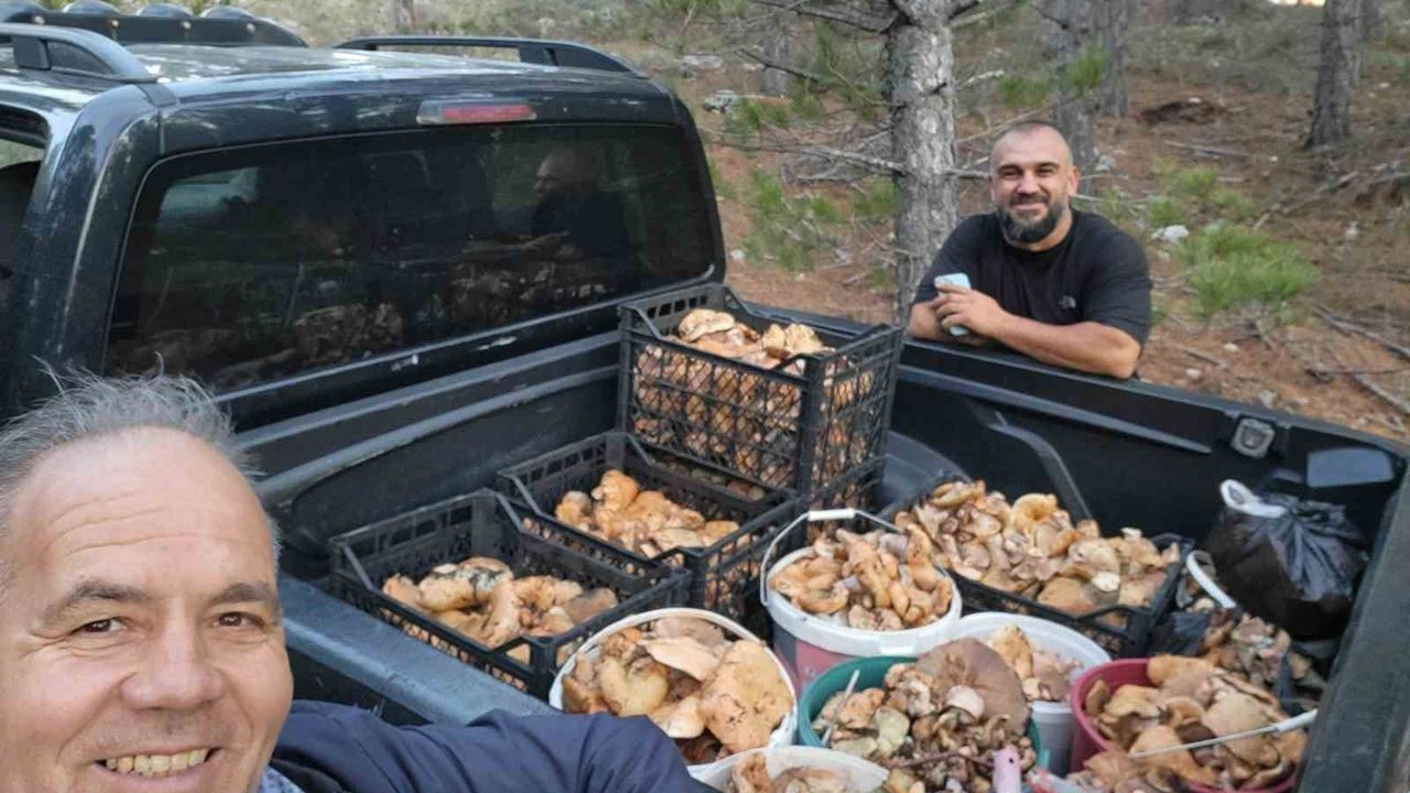 Denizli'nin Çameli ilçesinde yağışların ardından yeniden canlanan cintar sezonunda bir arkadaş grubu yaklaşık iki saatte kamyonet dolusu mantar topladı.