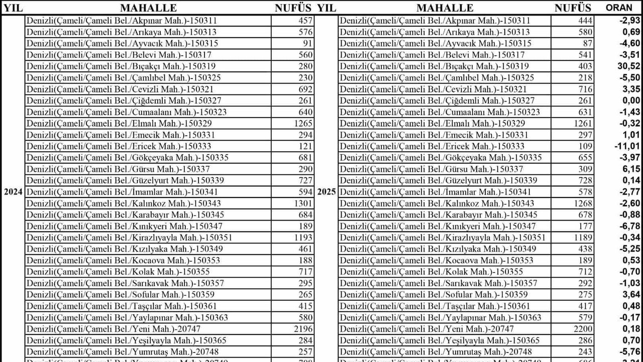TÜİK verilerine göre Denizli'nin Çameli ilçesinin nüfusu 2024 yılında 17 bin 492 iken, 2025'te 17 bin 447'ye geriledi. Belediye Başkanı Cengiz Arslan, bu durağan yapının Sakin Şehir vizyonuyla uyumlu olduğunu belirtti.