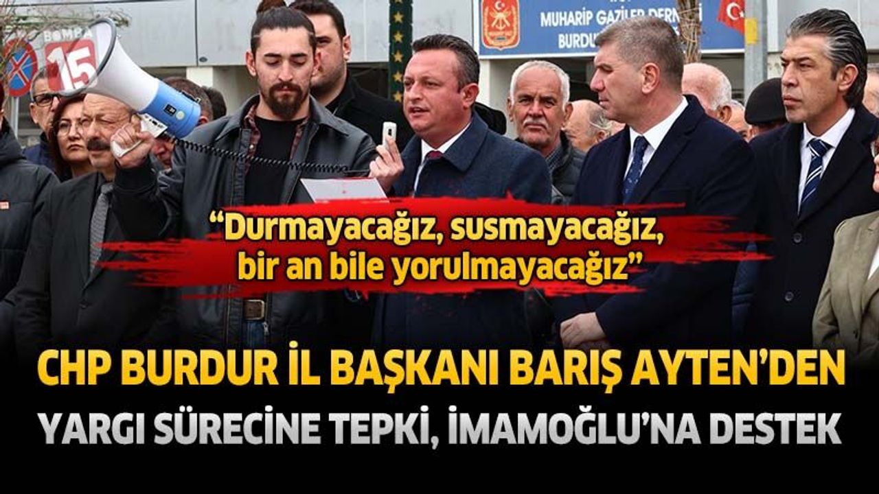 Barış Ayten ve CHP Burdur yöneticileri, Cumhurbaşkanı adayı Ekrem İmamoğlu’nun hukuksuzca tutuklanmasının 1. yılı dolayısıyla Cumhuriyet Meydanı’nda bir araya geldi. Basın açıklamasına Ali Orkun Ercengiz, Merkez İlçe Başkanı İlyas Divarcı ve çok sayıda yönetici katıldı.