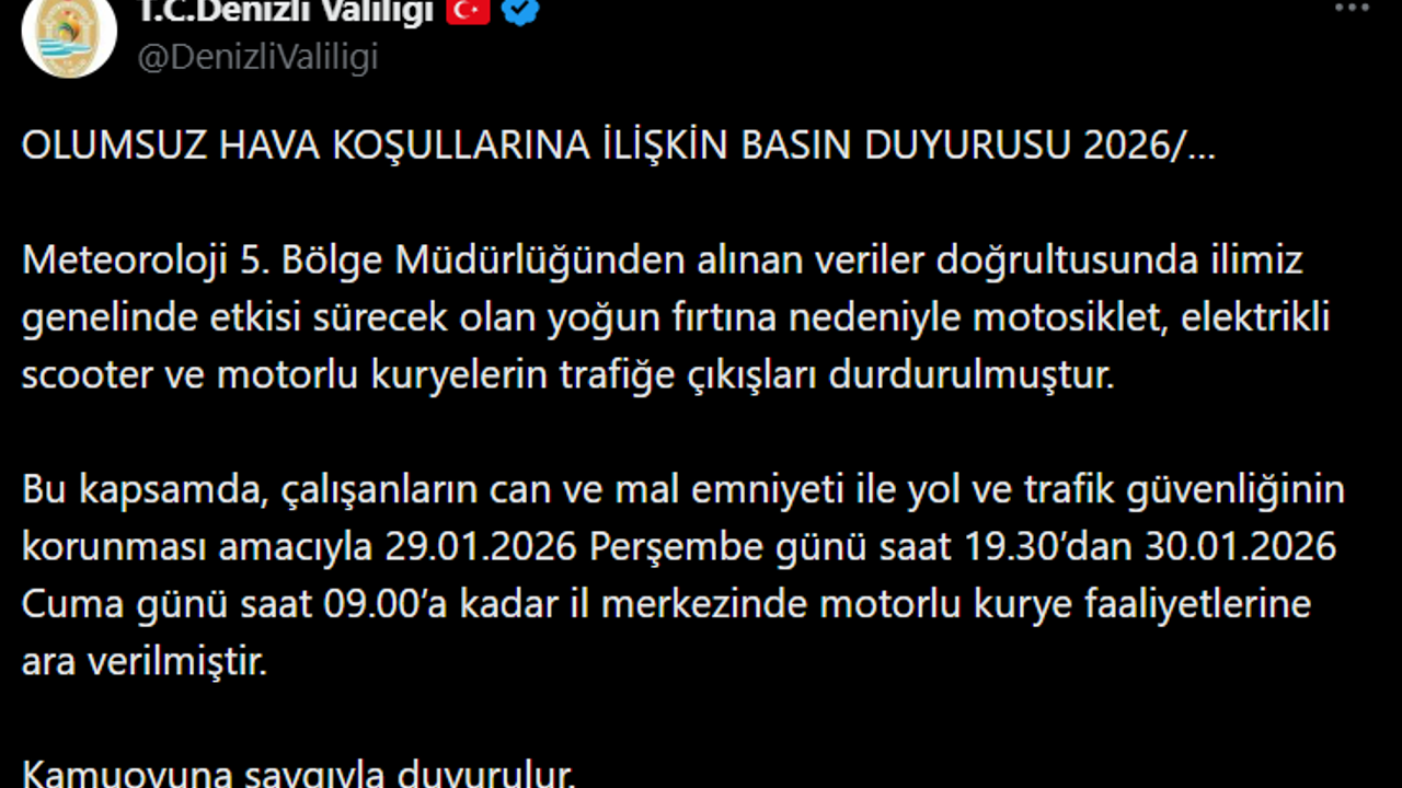Meteoroloji 5. Bölge Müdürlüğünden alınan veriler doğrultusunda il genelinde etkili olması beklenen yoğun fırtına nedeniyle, can ve mal güvenliğinin sağlanması amacıyla motorlu kurye faaliyetlerine ara verildi. Denizli Valiliği tarafından yapılan yazılı açıklamada, motosiklet, elektrikli scooter ve motorlu kuryelerin il merkezinde trafiğe çıkışları 29 Ocak 2026 Perşembe günü saat 19.30'dan, 30 Ocak 2026 Cuma günü saat 09.00'a kadar durdurulduğu ifade edildi.