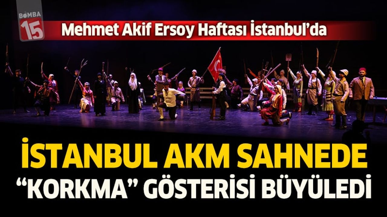 Mehmet Akif Ersoy Haftası kapsamında düzenlenen etkinliklerin İstanbul ayağında sahnelenen “Korkma” adlı teatral gösteri, Millî Mücadele döneminin ruhunu sahneye taşıdı. İstiklâl Marşı’nın yazıldığı tarihsel süreci merkezine alan gösteri, Mehmet Akif Ersoy’un iç dünyasından yola çıkarak müzik, beden ve hareket diliyle güçlü bir anlatı sundu. Anlatı temelli performans, izleyiciler tarafından uzun süre alkışlandı.