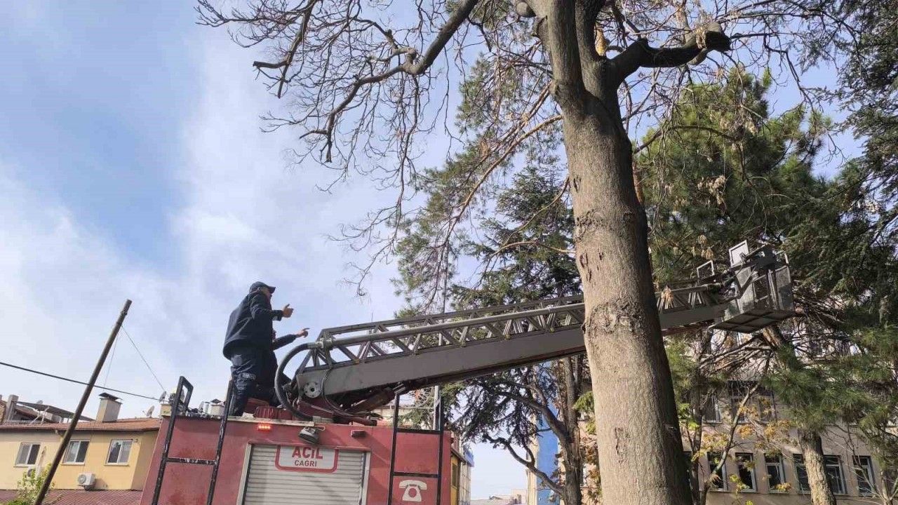 Ağaçtan indirilen ve hayli korktuğu gözlenen kedi tedavi için bakımevine yollandı.