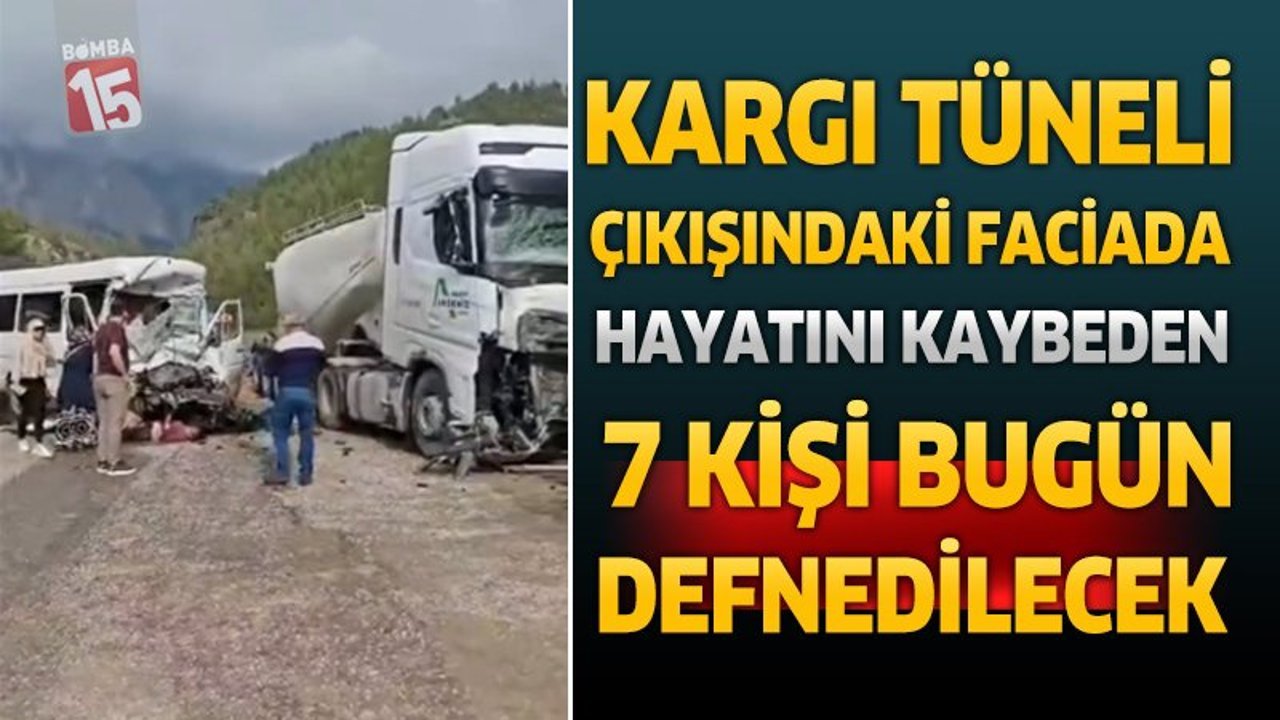 Isparta-Antalya Dereboğazı yolu Bucak Kargı Tüneli çıkışında dün meydana gelen trafik kazasında hayatını kaybeden 7 vatandaş, bugün son yolculuklarına uğurlanacak. Edinilen bilgilere göre, işçi taşıyan servis minibüsü ile çimento yüklü tırın kafa kafaya çarpışması sonucu yaşanan elim kazada 7 kişi yaşamını yitirirken, 2 kişinin tedavisinin sürdüğü öğrenildi.