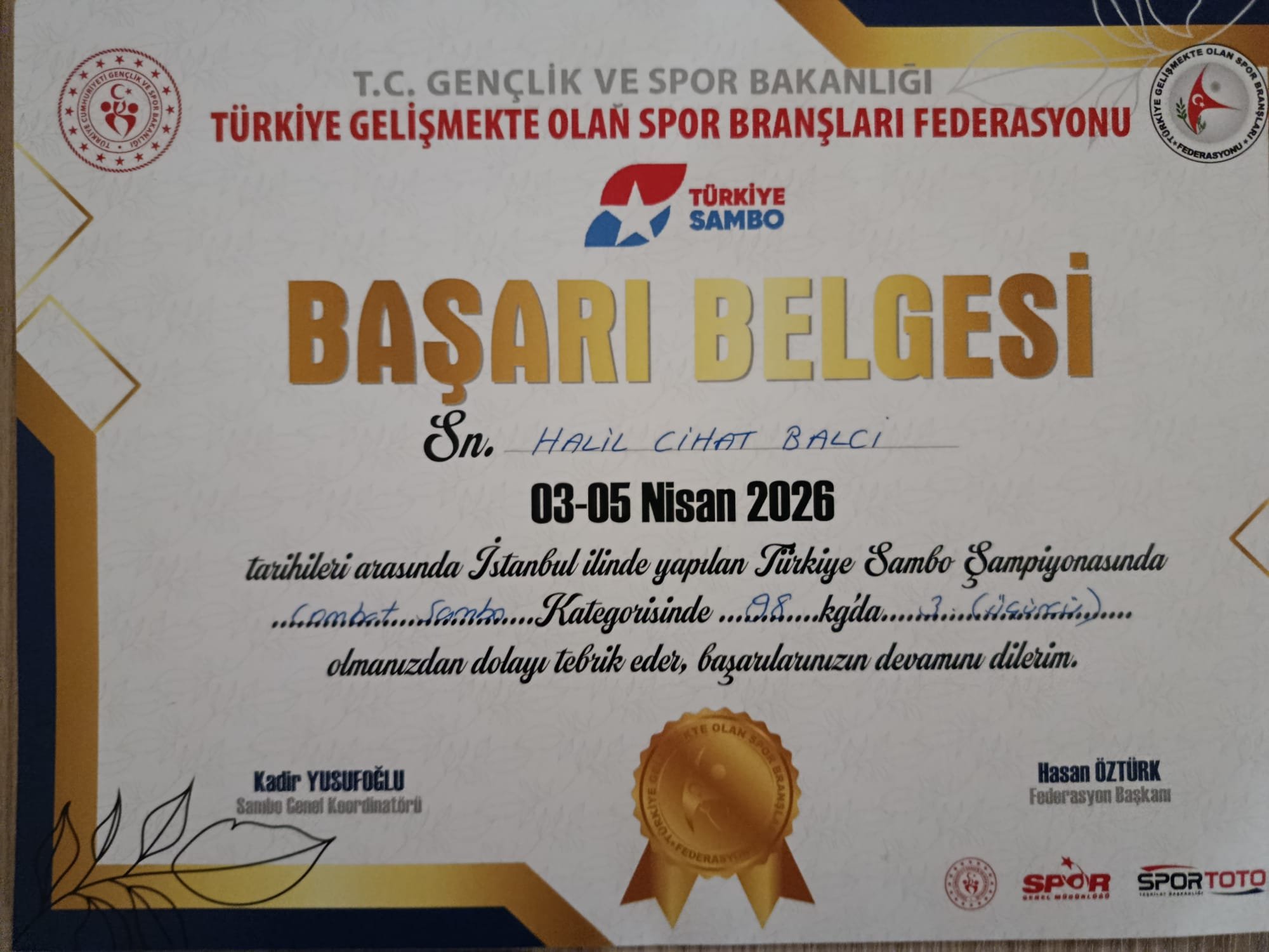 03–05 Nisan 2026 tarihleri arasında İstanbul Ata Sporları Merkezi’nde gerçekleştirilen Ümitler, Gençler ve Büyükler Sambo Türkiye Şampiyonası’nda, Burdur Mehmet Akif Ersoy Üniversitesi (MAKÜ) Sanat ve Tasarım Fakültesi Görsel İletişim Tasarımı Bölümü 4. sınıf öğrencisi Halil Cihat Balcı, büyükler 98 kilogram combat kategorisinde Türkiye üçüncüsü oldu.