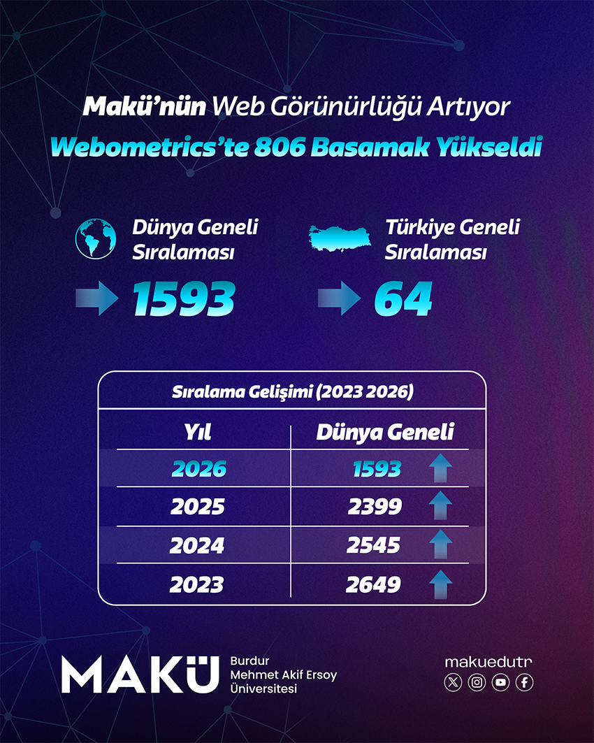 Burdur Mehmet Akif Ersoy Üniversitesi (MAKÜ), uluslararası üniversite sıralama sistemlerinden biri olan Webometrics’te son yıllarda dikkat çekici bir yükseliş kaydetti. 2023–2026 dönemini kapsayan veriler, üniversitenin dünya sıralamasındaki ilerlemesinin küresel ölçekte dijital görünürlüğünün güçlendiğini ortaya koyuyor.