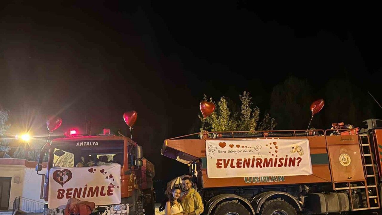 Antalya’nın Serik ilçesinde orman işçisi, görev yaptığı arazöze "Seni seviyorum, benimle evlenir misin?" yazılı pankart asarak kız arkadaşına unutulmaz bir evlilik teklifi yaptı.
